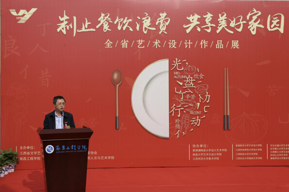 为了深入贯彻落实习近平总书记关于厉行勤俭节约、制止餐饮浪费的重要指示精神,响应全省自上而下发出的厉行节约倡议,在全社会营造浪费可耻、节约为荣的氛围,3月26日下午,“制止餐饮浪费、共享美好家园”江西省艺术设计作品展在南昌工程学院开幕。本次展览由江西省文学艺术界联合会、南昌工程学院主办,江西省美术家协会、南昌工程学院人文与艺术学院承办。原江西省政协副主席肖光明,原南昌大学党委书记郑克强,原江西省文联副主席、省美协主席蔡超,中国书法家协会副主席、中国美协理事、江西省文联副主席毛国典,南昌工程学院校长金志农、副校长汪胜前、周敏丹等出席开幕式,江西省美术家协会、江西省工艺美术学会、江西日报社、江西师范大学艺术学院、南昌大学艺术与设计学院、南昌工程学院党委宣传部、教务处、学工处、团委等相关负责同志以及南昌工程学院人文与艺术学院的师生参加了开幕式。开幕式由南昌工程学院纪委书记殷安全主持。