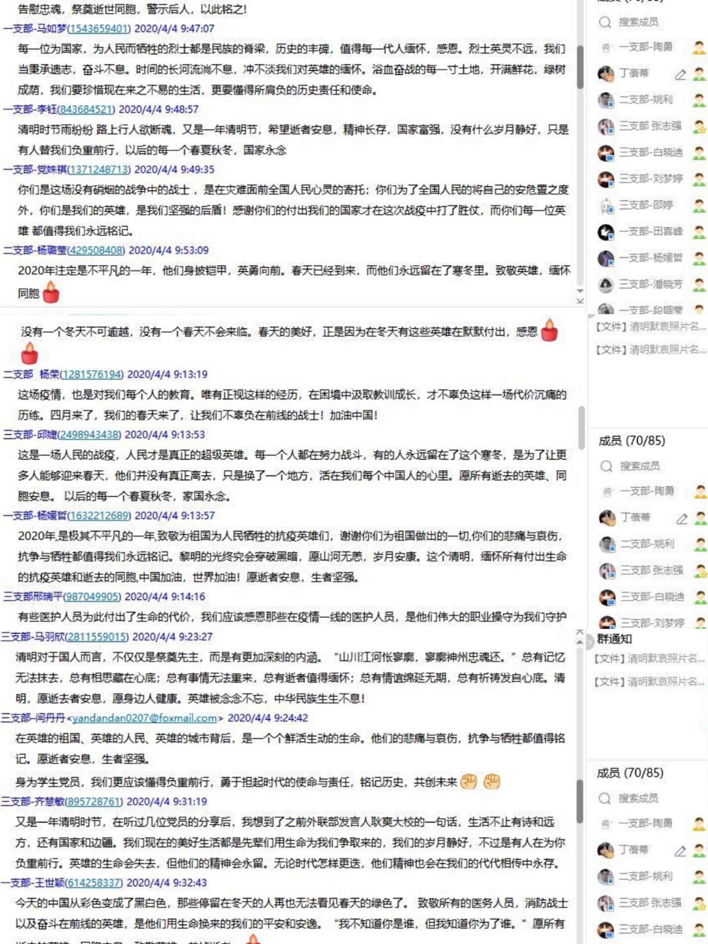 活动中,全体学生党员积极发表感悟,用指尖在云端祭奠英烈。学院学生党员还分别推出朗诵视频《一名党员,一面旗帜》及《战“疫”家书:健康所系,性命相托》,表达对抗击新冠肺炎疫情斗争牺牲烈士和逝世同胞的深切哀悼,更表达了我院学生党员浓厚的爱国之心。在全国性哀悼活动进行中,人文与艺术学院各支部党员也响应号召,全体党员各自在家中静立默哀三分钟,用庄严肃穆的仪式,寄托血浓于水的同胞之情,也昭示着慨然前行的奋发斗志。