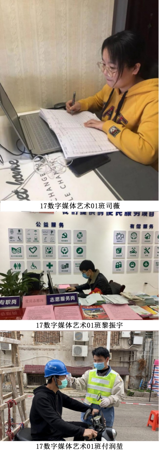 南昌工程学院人文与艺术学院数字媒体艺术专业的同学,积极响应学校和学院的号召,主动投身战疫一线。他们是16数字媒体艺术的周晋、17数字媒体艺术的司薇、黎振宇,18数字媒体艺术付润堃,他们用实际行动践行了一名合格的新时期有责任、有担当的当代大学生的思想风貌。